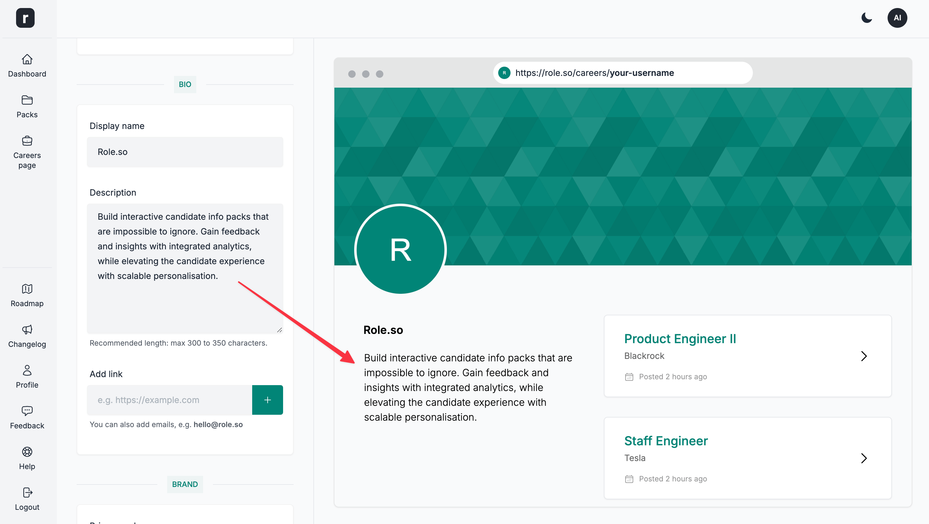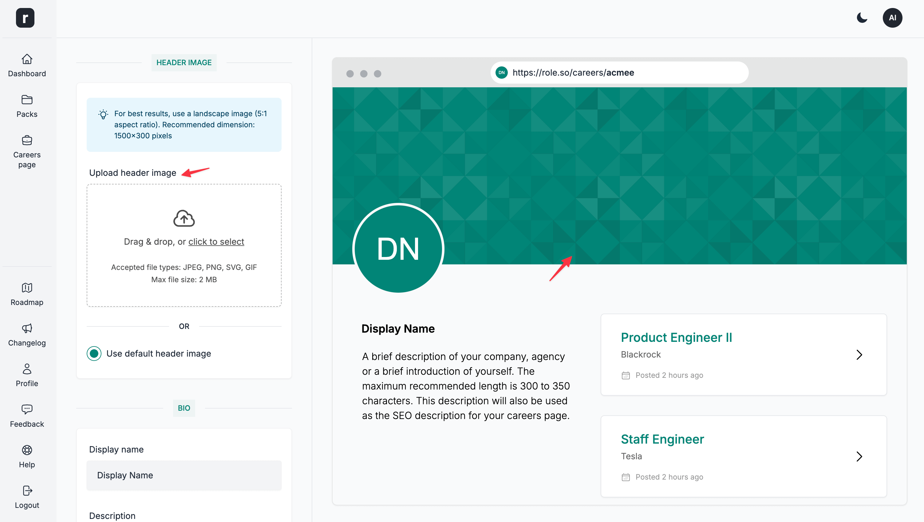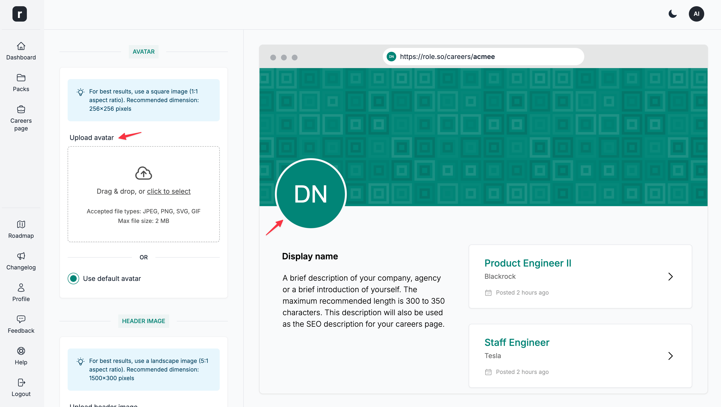 Your careers page will be available under this username (e.g. https://role.so/careers/USERNAME). If you have a custom domain configured, the careers page will be available at https://YOUR-DOMAIN.com/careers/USERNAME.