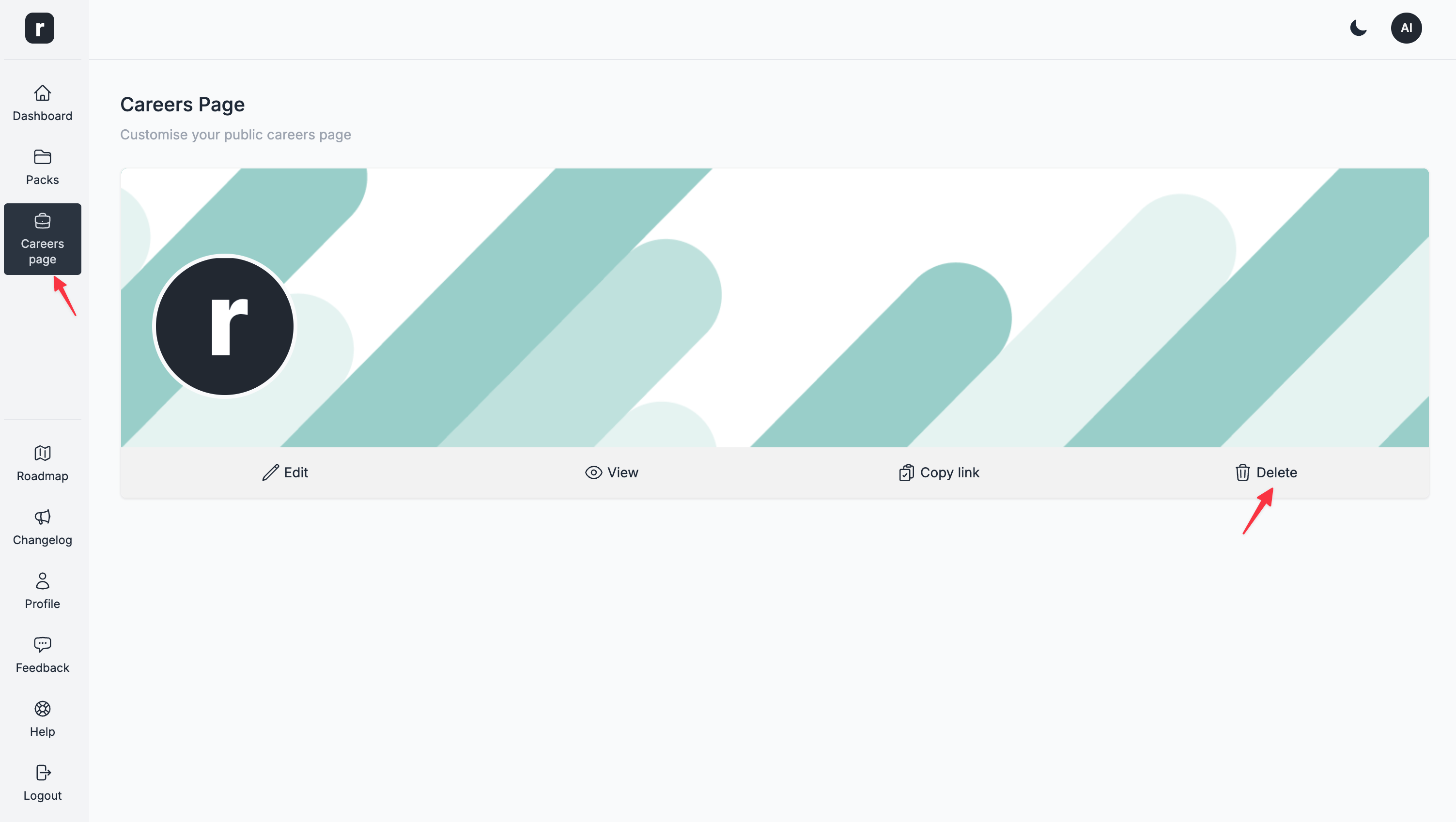 Deletebutton on the confirmation modal to delete your careers page