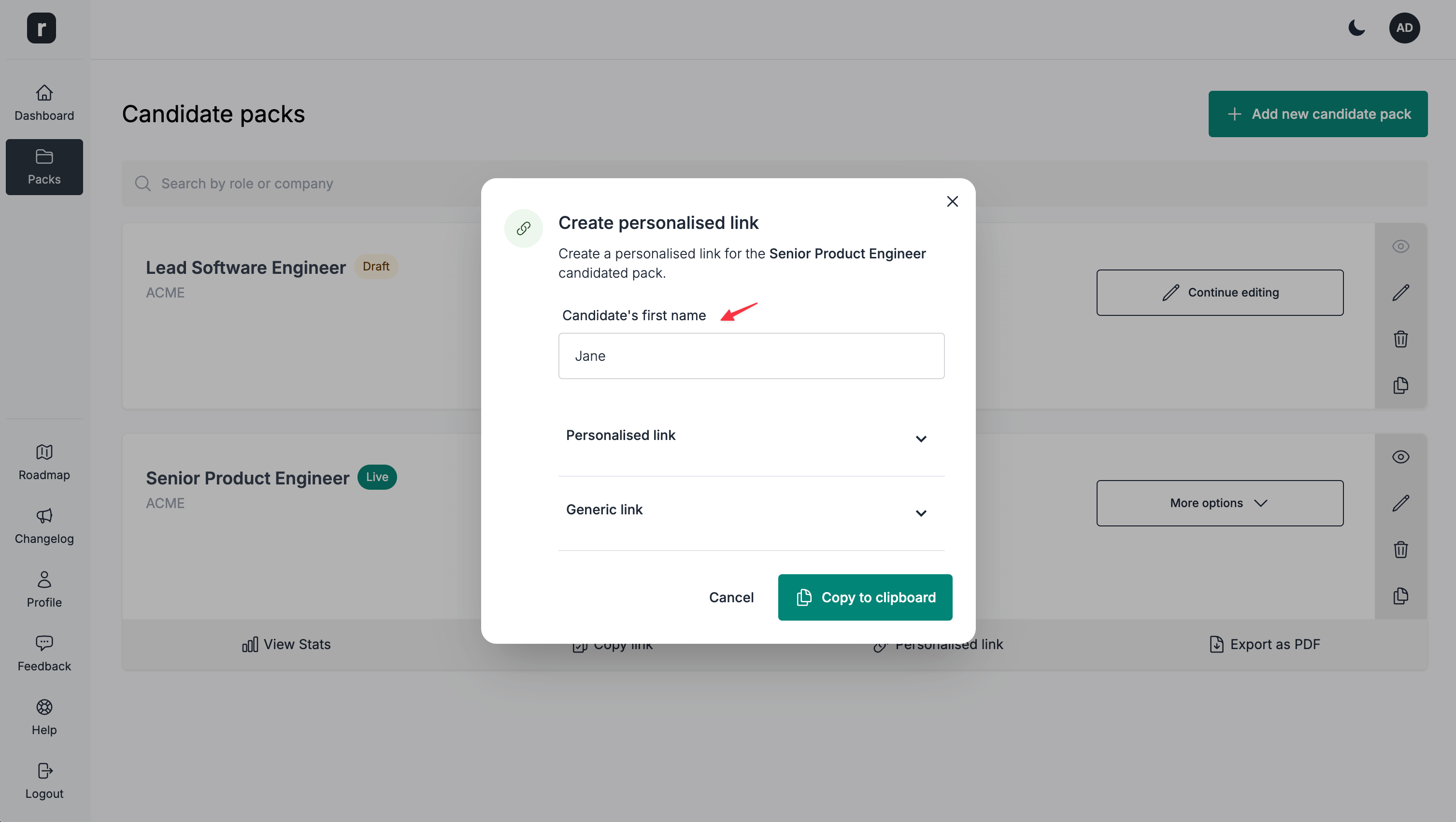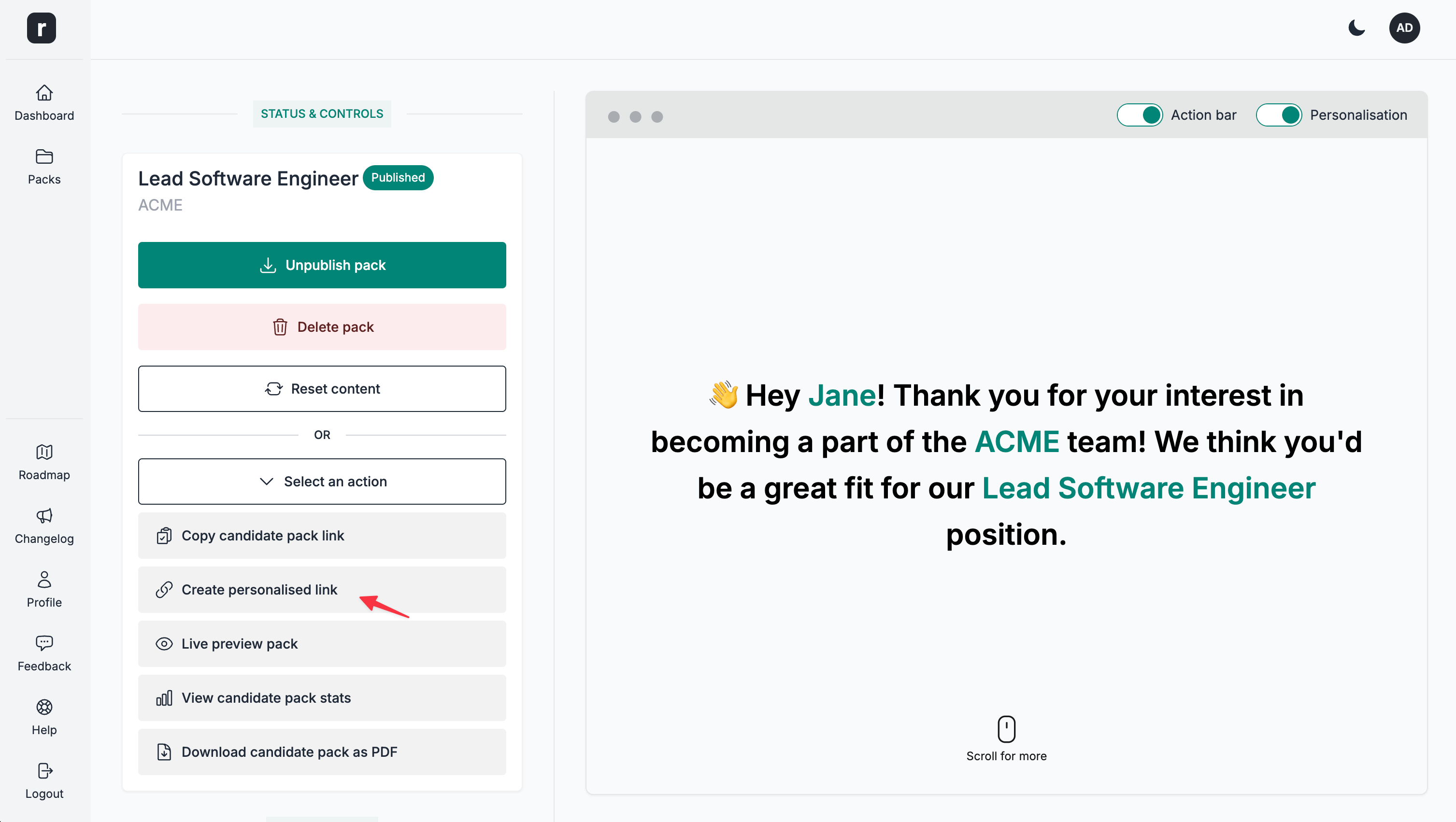 Create a personalised candidate pack link