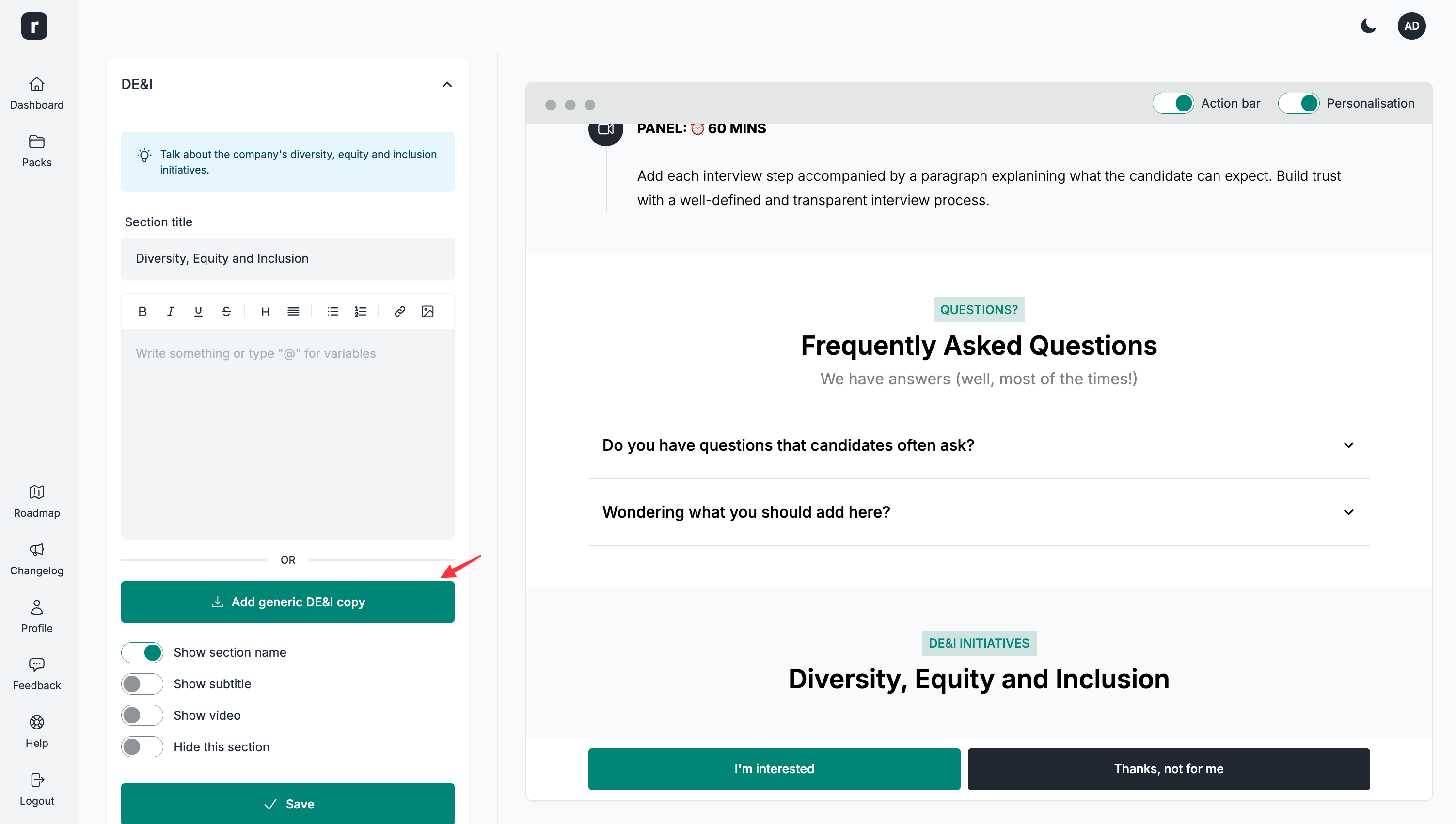 The candidate pack offers you a special section to talk about the company's DE&I framework (Diversity, Equity, and Inclusion). To help you get started, you can add a generic copy. This generic copy is currently available in English only.