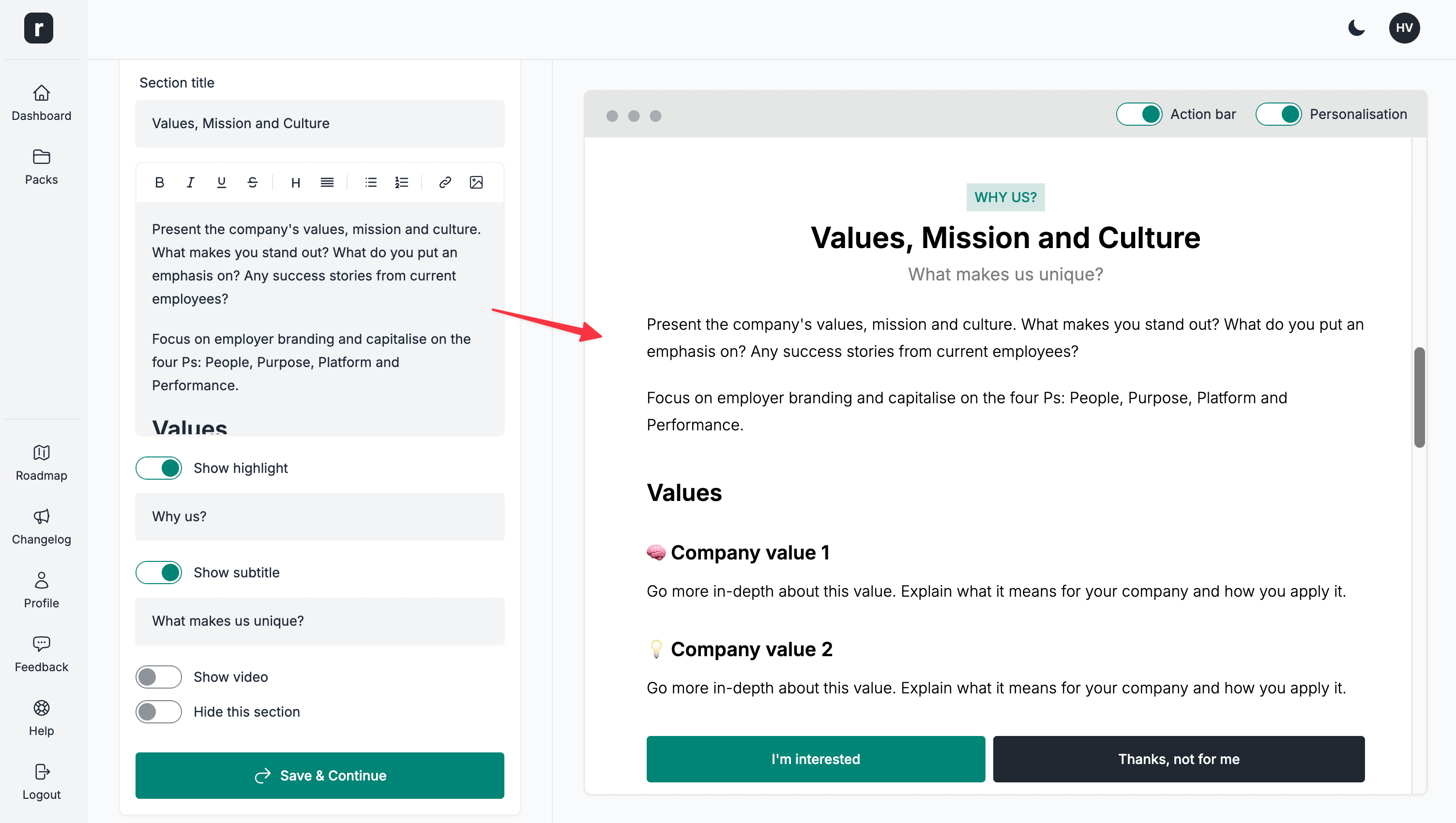 - While changes are immediately visible in the preview, you must save each section in part for the changes to be applied on public candidate pack page. You can save the section by clicking the